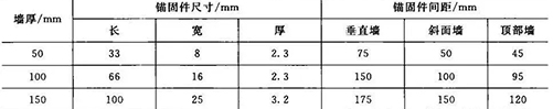 ⑤一般情况下,金属锚固件的间距为施工厚度的1.5〜3倍。垂直墙取值高些;顶部墙取值低些。表2显示了Y形条形截面金属锚固件的配置实例。