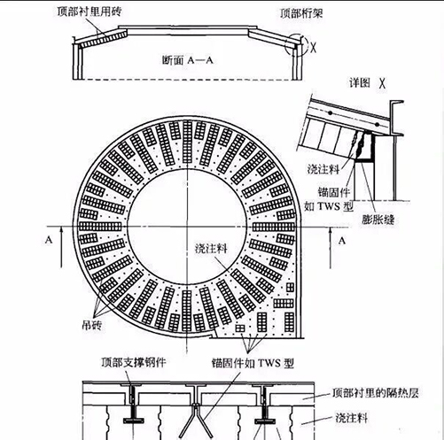 一般情况下,金属锚固件的前端温度应小于1000°C。1000°C以上时,需要使用锚固砖或陶瓷锚固件。锚固砖通常都露出加热面,但短的锚固砖也可以不露出表面。锚固砖表面需涂刷有机物质,起防失水和留设膨胀缝之用。锚固砖的间距炉顶为200〜300mm,侧墙为300〜500mm不等。图2显示了旋风筒吊顶 所采用的锚固砖-浇注料复合结构。